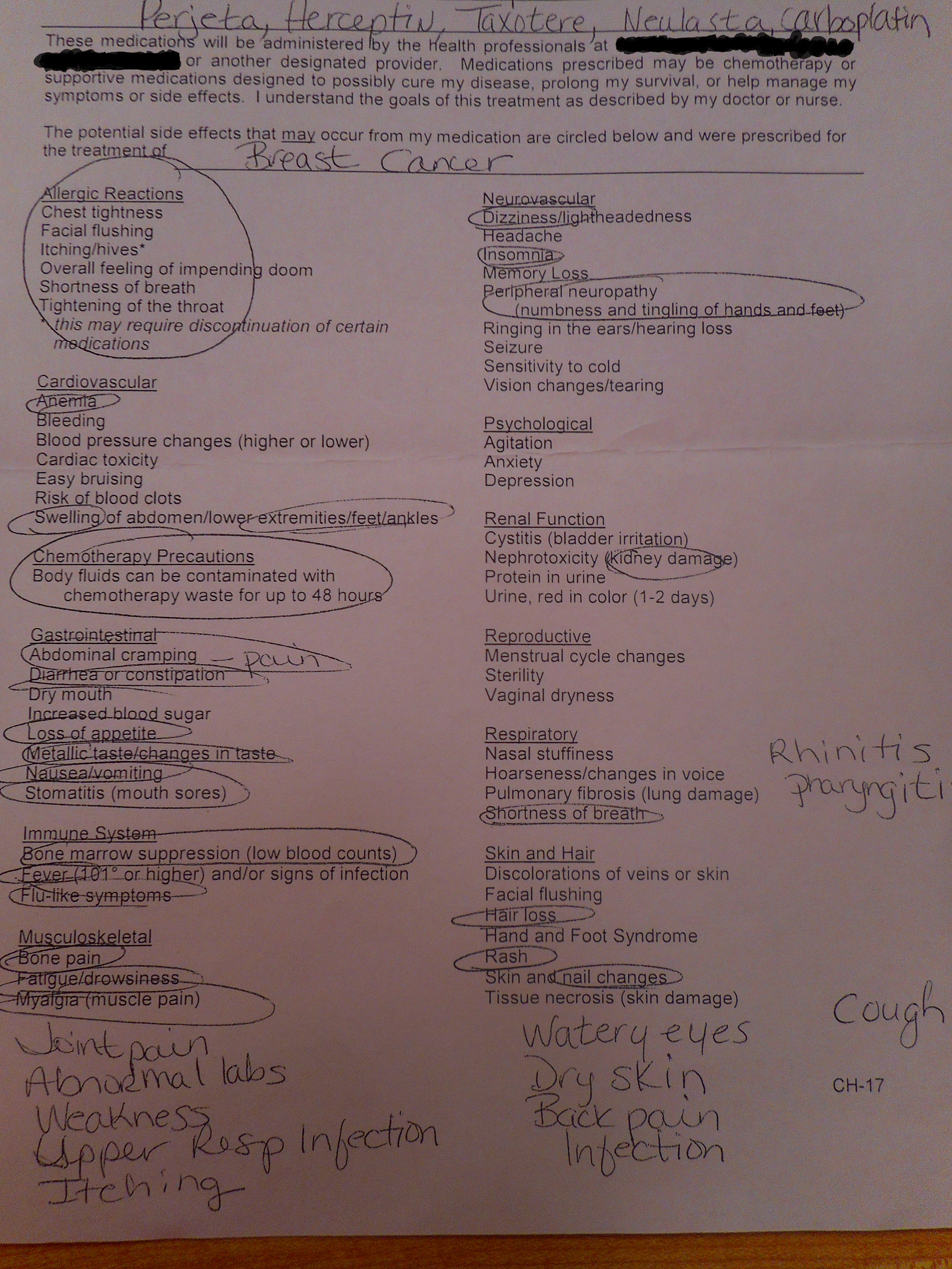 I met with the doctor, but it really was just a cursory visit. The main reason I was there was for the chemotherapy. At a previous visit, I had been warned that I was going to be there all day. They stretch the dosage out so that they can manage any reactions to the medicine. The reactions, or lack thereof, determine how long each subsequent dose of each chemotherapy drug will take. Before we started, I was given a list of possible side effects of the drugs I was being given.