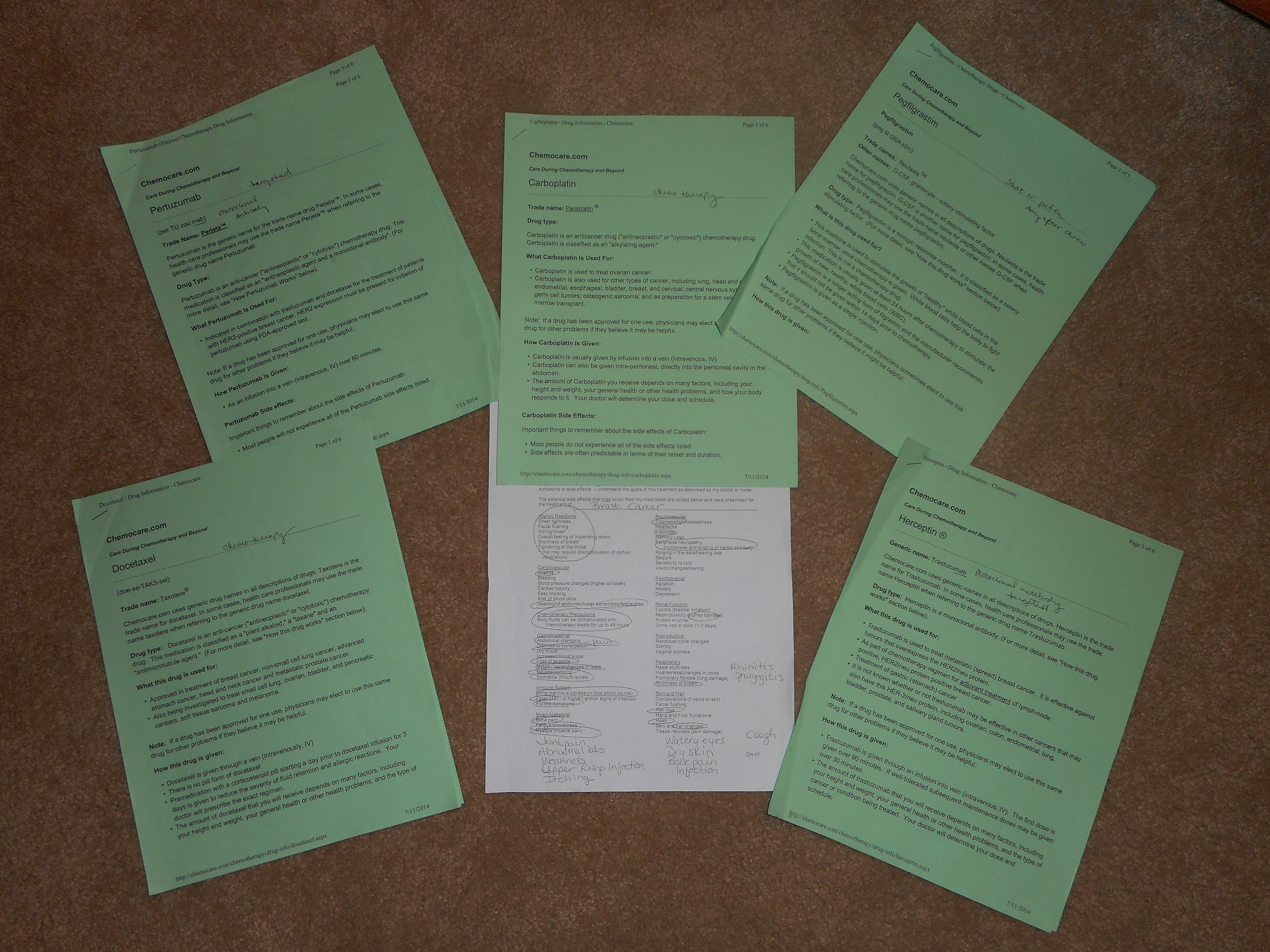 The green ones are information packets over SIX pages long. So all total, I was given nearly 17 pages of side effects to anticipate and to fear.