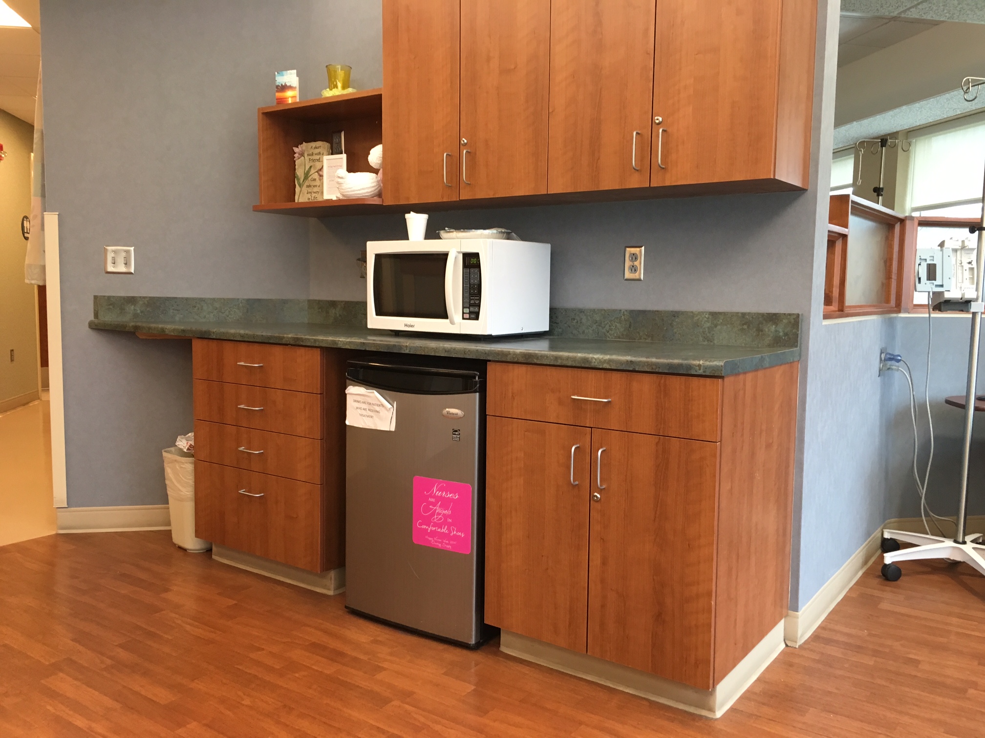 If the patient gets a little thirsty or hungry, they have a refrigerator with drinks and cabinets with snacks. The microwave is for rice heating pads.