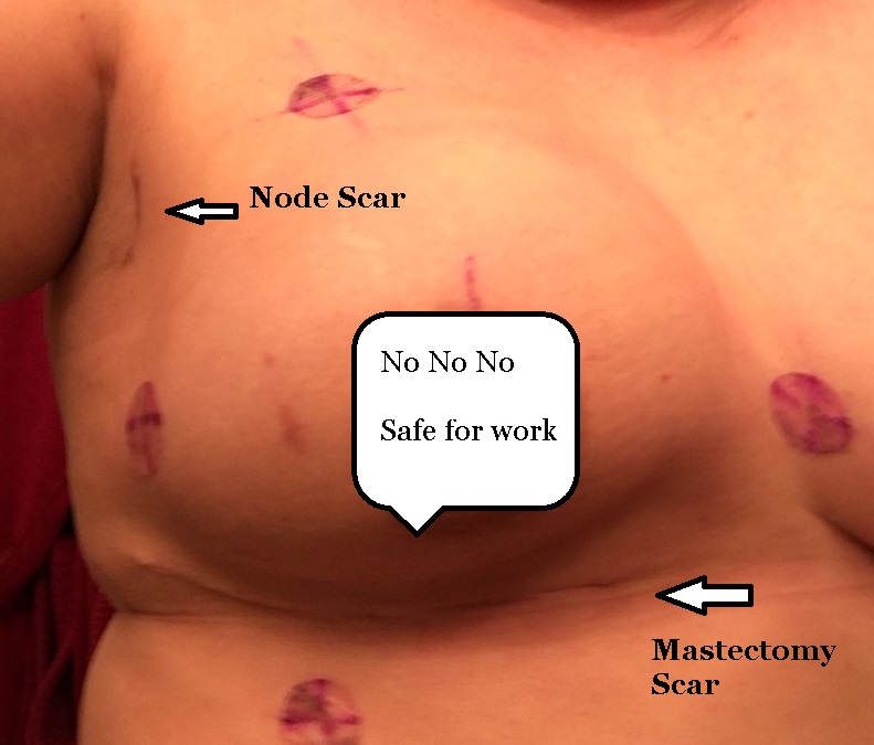 Once they had all of my insides mapped out, they drew on me in purple sharpie. Also, I was given two small tattoos—the size of a pinhole—on either side of my breast in the middle of the sharpie marks. I can shower, but I’m not supposed to scrub the sharpie off. However, the tattoos are there so if the sharpie comes off, they can line me up properly each time. It looked like they had done a ritual on me, but I was pretty confident all was well as there had been no chanting.